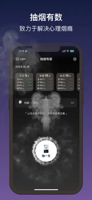 It's well known that the hardest part of quitting smoking is overcoming psychological cravings. This app is dedicated to addressing smokers' psychological dependencies. Through features like daily check-ins, simulations, and animated effects, users can gradually overcome their psychological cravings, effectively reducing the impact of these cravings on their quitting progress and significantly lowering relapse rates.